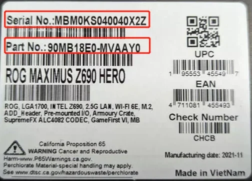 Bạn có thể kiểm tra bo mạch Z690 Hero của mình có bị lỗi hay không bằng việc kiểm tra số seri trên bo mạch (vị trí mặt trên hoặc mặt dưới của bo mạch, hoặc được dán trên vỏ hộp) hoặc nhập số seri vào công cụ kiểm tra của Asus.